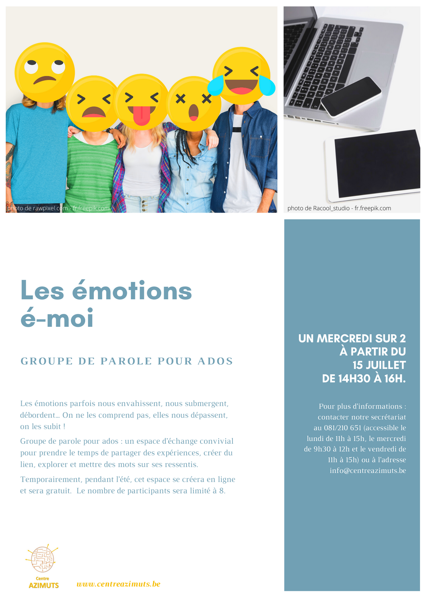 Oona et Paola, respectivement sophrologue et art-thérapeute, vous proposent un groupe de parole pour tous les ados qui souhaitent échanger sur leurs ressentis. Durant l’été, ces groupes se dérouleront en ligne. Vous trouverez plus d’infos via le secrétariat.